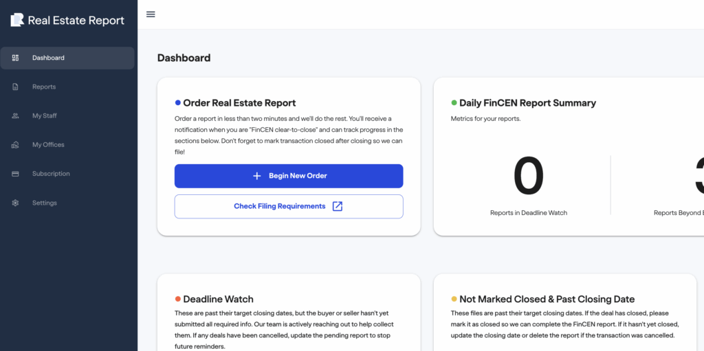 This guide will walk you through how to order a report on the FincenRealEstateReport.com dashboard. This process typically only takes 2 minutes and includes 75% of the work you need to do for each report. The remaining 25% is letting us know a transaction closes so we can file your FinCEN report.