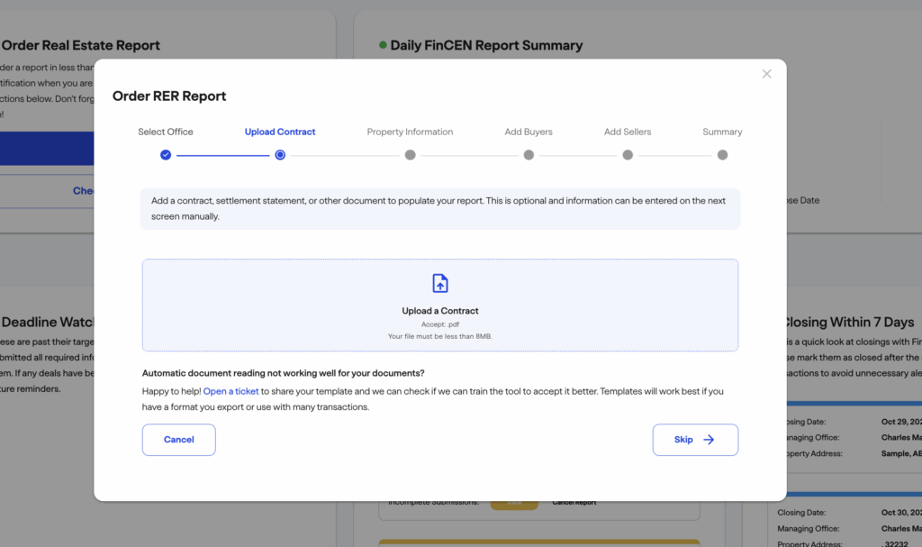 If you drop a file like a settlement statement, contract from the real estate agent, or another information form about the transaction, our smart scanning tool will look for fields that are part of the order process and auto-populate these. In the next steps, you should check any imported information for accuracy if you use this tool before finalizing your order. If you have a form you would like to use for many transactions, get in touch with a support ticket by clicking support in your portal and our team can train the system to use that form as well.